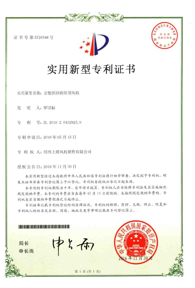 | 方便拆卸的房頂風(fēng)機專利證書 |